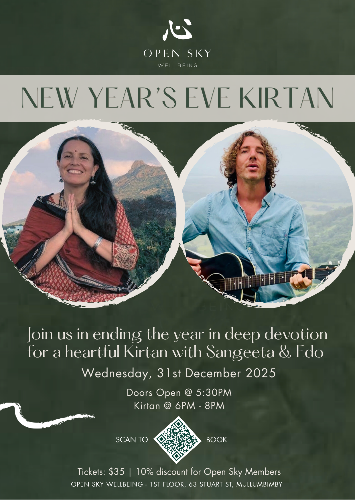 Join us on Tuesday, 31 December 2025 for a beautiful evening of Kirtan at Open Sky Wellbeing in the heart of Mullumbimby.